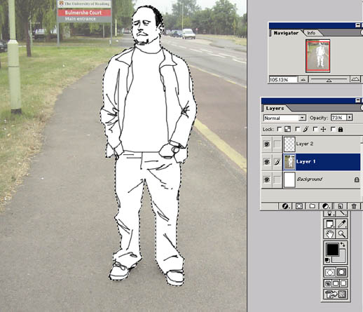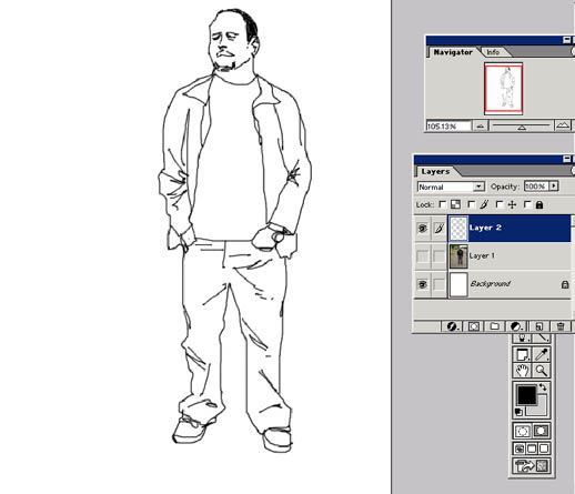 Step 2: Open the photo in Photoshop (or another similar graphics program). You need to have a white base layer, then another layer with the photo in it and then a transparent layer above it. Three layers, ok? You're going to trace the photo in the top, transparent layer. To make things easier to trace, you might like to reduce the opacity of the photo layer (but remember to click back on the top layer or you end up tracing in the photo layer, which is very annoying).