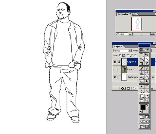 Step 5: Use the magic wand, and in the top transparent layer, click outside the tracing, so that everything except the tracing is selected. Then, go to Select > Inverse. Now, only the tracing should be selected. See below for exciting results.